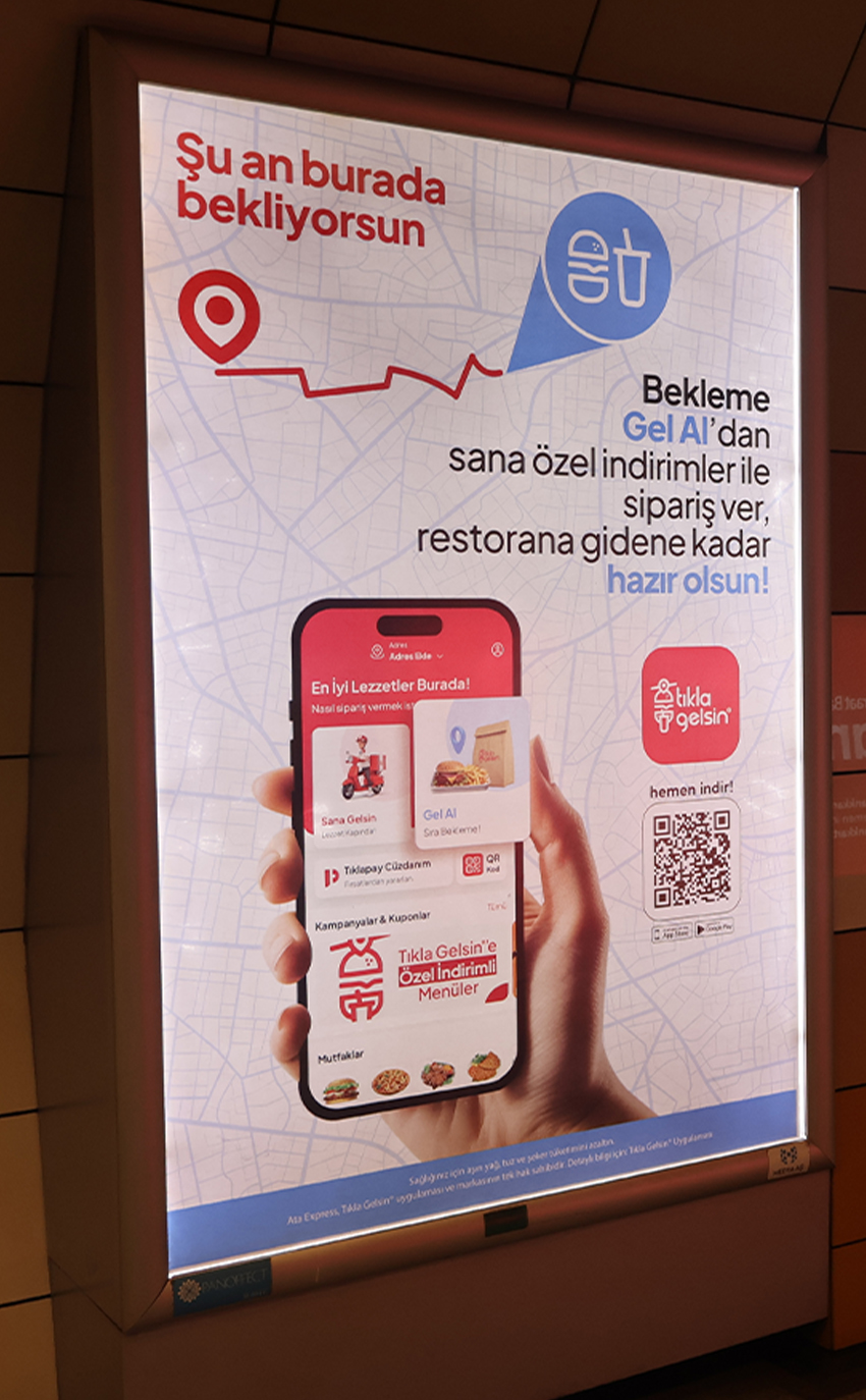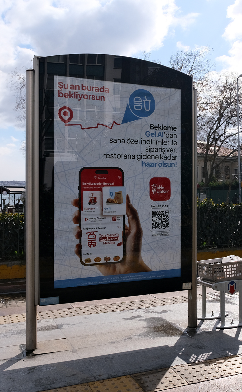 Tıkla Gelsin platformunun Gel Al hizmetinin bilinirliği düşüktü çünkü kullanıcılar için yemek siparişi alışkanlığı eve beklenmesi üzerineydi. Oysa, Tıkla Gelsin Gel Al, farklı avantajlar sunuyordu. Yani, bunu duyurma zamanı gelmişti! Açık hava mecralarını iç görü odaklı konumladık. İnsanların “beklediği” lokasyonları, bekleme süreleri boyunca Gel-Al’da onları ne “beklediğini” anlatarak yemek siparişini “beklemeden” vermelerini teşvik ettik.